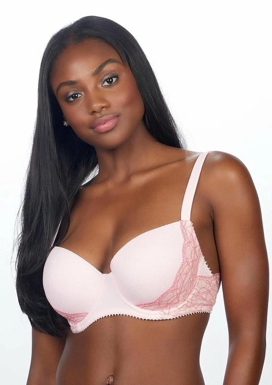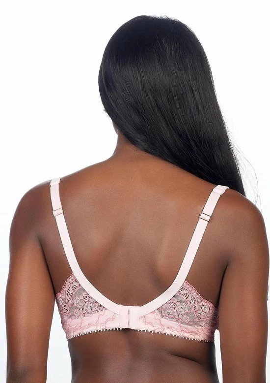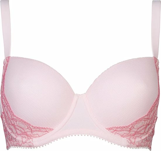 Een licht roze voorgevormde beugel bh. De cup is afgewerkt met mesh en kanten details in de kleur licht roze met accenten in donker roze, dit loopt door aan de zijkant en achterkant. De schouderbandjes zijn verstelbaar. Haak- en oogsluiting achterzijde afhankelijk van maat 4×2 haaks of 4×3 haaks.