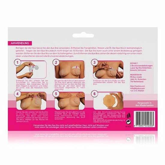 De Bye Bra plak bh is de oplossing om snel en efficiΓ«nt de borsten van een vrouw te liften, zonder dat er een BH of een operatie bij te pas komt. De Bye Bra is heel dun en bevat een flexibel zelf plakkend folie. Hiermee is het mogelijk de tepels centimeters te liften of om de borsten te corrigeren. De gepatenteerde 3M tape is veilig voor de borsten, wat wij niet kunnen onderstrepen bij Chinese kopieΓ«n die we hier en daar op de markt zien. Ook wanneer borsten verschillen in grote of vorm is de Bye Bra plak beha een uitkomst vanwege het corrigerende vermogen.