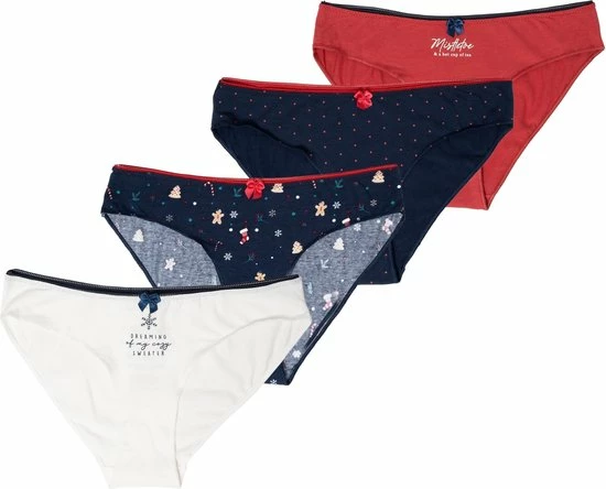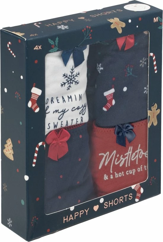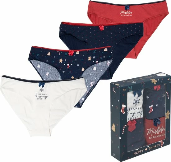 Happy Shorts dames kerst ondergoed special. Voordeel pack van 4 kerst dames slips () verpakt in een leuke geschenkverpakking. De kerstspecial onderbroeken zijn alleen tijdelijk verkrijgbaar.