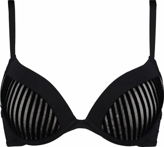 Deze push up bh is uitgevoerd in een gladde stof aan de bovenzijde van de cups en rondom, gecombineerd met mesh stof op de cups. De mesh stof is versierd met een streeppatroon.