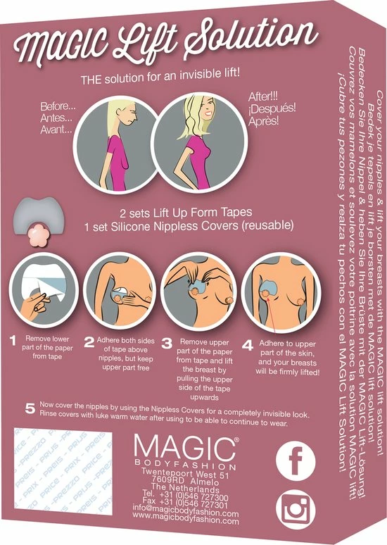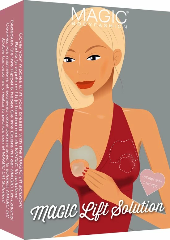 MAGIC Lift Solution zorgt onmiddellijk voor een jongere uitstraling door het liften van je borsten. Deze huidvriendelijke siliconen tapes zijn eenvoudig boven de tepels te bevestigen. De borst wordt gelift door de bovenkant omhoog te trekken en dan vast te plakken. De speciale Silicone Nippless Covers komen op de tepels voor een onzichtbaar effect. Was ze met lauw water en laat deze drogen in de open lucht zodat je ze nogmaals kunt dragen.