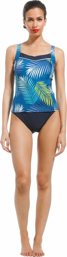 De tankini top heeft rechte hals met hele subtiele V en soft cups (voorgevormde cups met padding) voor extra ondersteuning en comfort. De top is extra hoog dicht gesloten en de bandjes zijn net wat breder en staan aan de achterzijde dichter bij elkaar zodat dit meer stevigheid biedt. Ook is het mogelijk om de bandjes aan de achterzijde te verstellen.