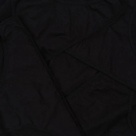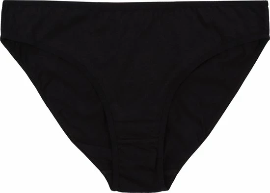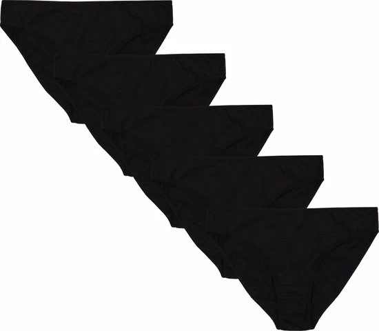 Een set zwarte damesslipjes in een korte snit met een ingenaaid niet-samendrukkend elastiek in de taille.