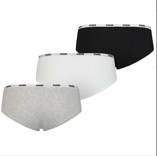 Hoge kwaliteit dames 3-pack PUMA hipsters bestaande uit een witte, grijze en zwarte hipster. De basis van deze dames hipster is gemaakt van katoen, modal en elastaan wat resulteert in een ademende, zachte stof met een aansluitende fit. De hipsters hebben een subtiele elastische band voorzien van het PUMA logo.