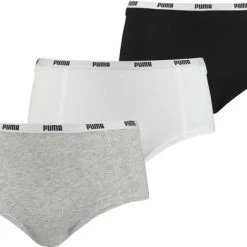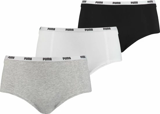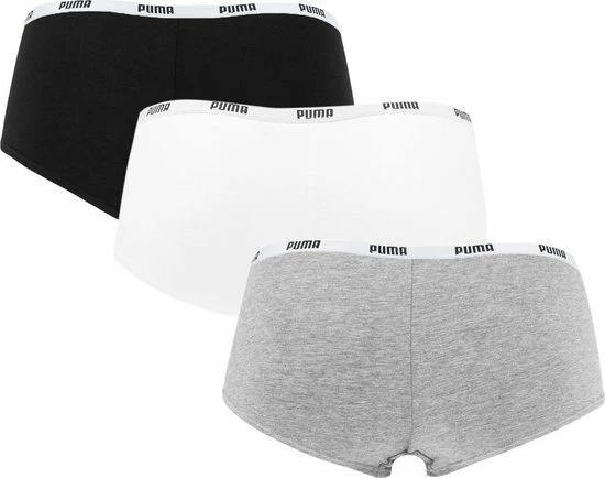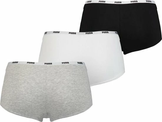 Hoge kwaliteit dames 3-pack PUMA mini shorts bestaande uit een witte, zwarte en grijze short. De basis van deze dames mini shorts is gemaakt van katoen, modal en elastaan wat resulteert in een ademende, zachte stof met een aansluitende fit. De hipsters hebben een subtiele elastische band voorzien van het PUMA logo.