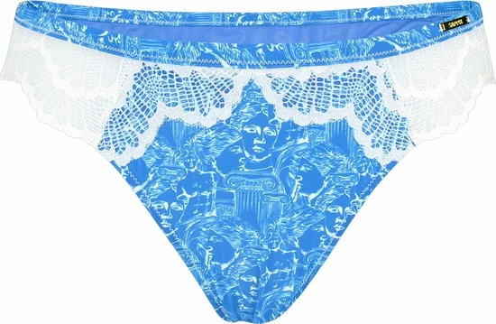 De Cupra is een string met prachtige kanten details, waarbij een blauwe stof met verrassende witte is te vinden. Aan de voorkant bij het kruis is de blauwe stof met print te zien. Dit is van microstof gemaakt. Een zachte en ademende stof, waarmee wij jou extra draagcomfort kunnen garanderen. De witte kantendetails aan de voorkant zijn aan de achterkant niet terug te zien. Daar is namelijk gebruik gemaakt van een blauwe effen stof . Ben je al verliefd op dit engeltje? Je kan de Cupra met een bijpassende push-up BH of T-shirt BH dragen. Ons model is 175 cm en draag maat M.
