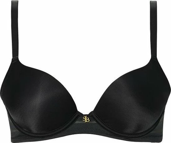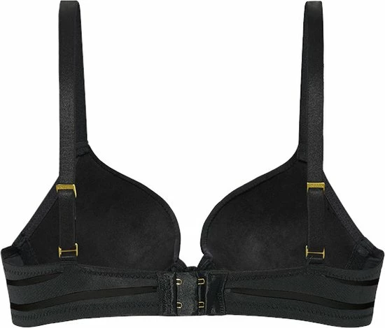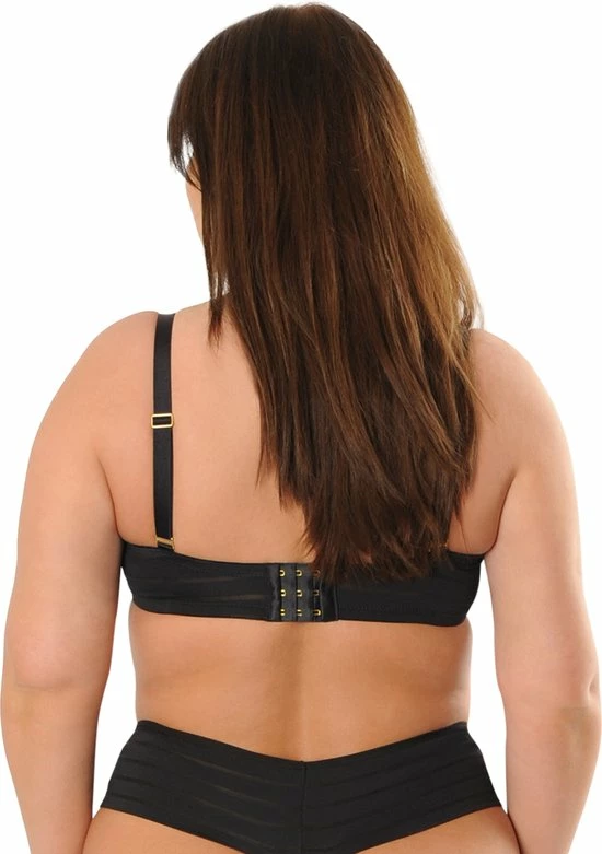Deze comfortabele push-up BH is in een mysterieuze zwarte kleur. Het model heeft cups van een zachte stof. De band heeft een mesh streep patroon. Tussen de cups is een elegant hangertje aangebracht. Het model heeft schouderbandjes en sluit aan de achterkant.