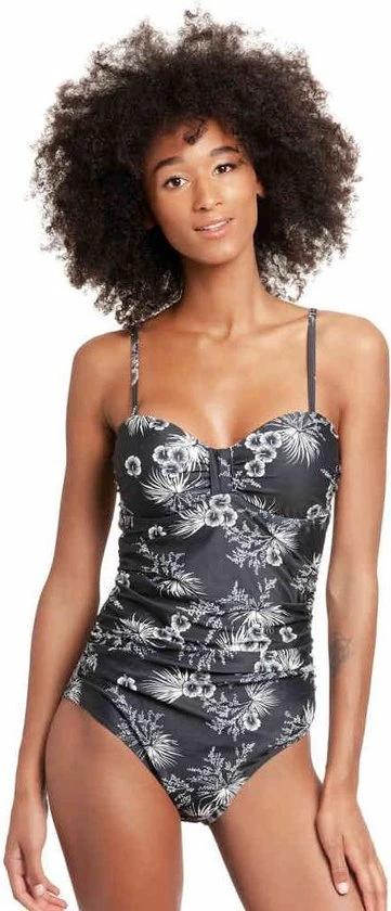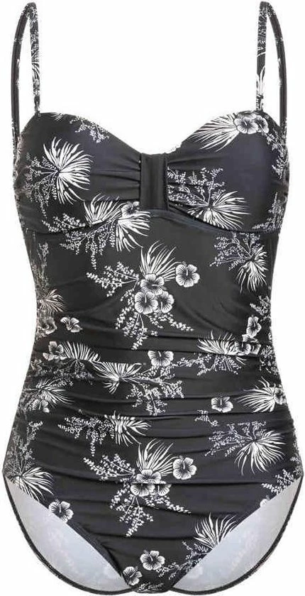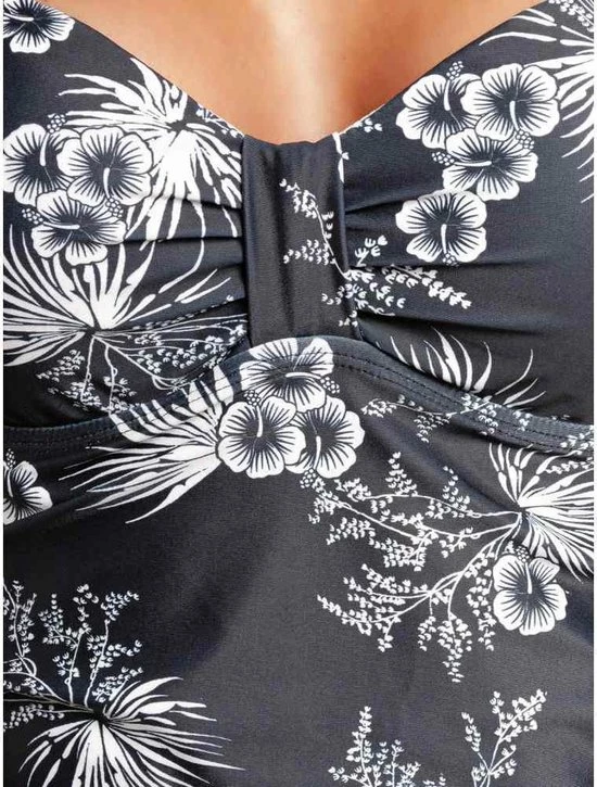 Dit schattige zwempak van Vive Maria is gemaakt van een geweldig polyester materiaal. Het heeft dunne verstelbare bandjes en een mooie hartvormige halslijn. Een ronde onderbuste naad en kleine ruches zorgen voor een mooi decolletΓ©. Rimpels in de buikstreek verbergen optisch kleinere probleemgebieden. De print toont witte Hawaiiaanse bloemen en bladeren op een zwarte stof. Het badpak is gevoerd met een polyester stof.